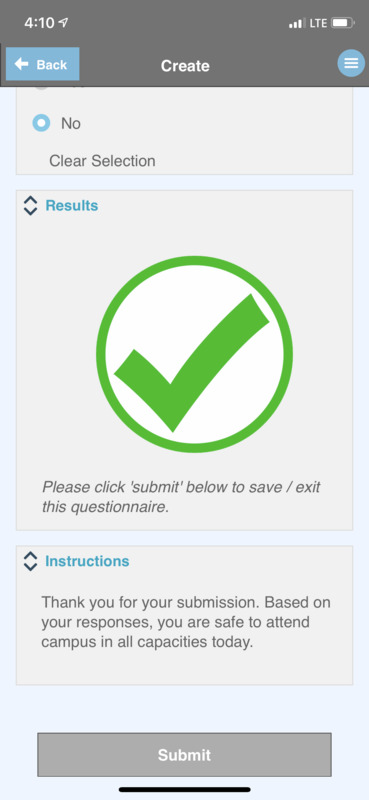 After filling out the survey, based on the student's answers they will either receive a big green checkmark that indicates that they are permitted onto campus, a yellow caution sign and warning that if you are not feeling well enough to then stay home, or a red circle with a line through it and a message that the student is not allowed on campus and must quarantine.