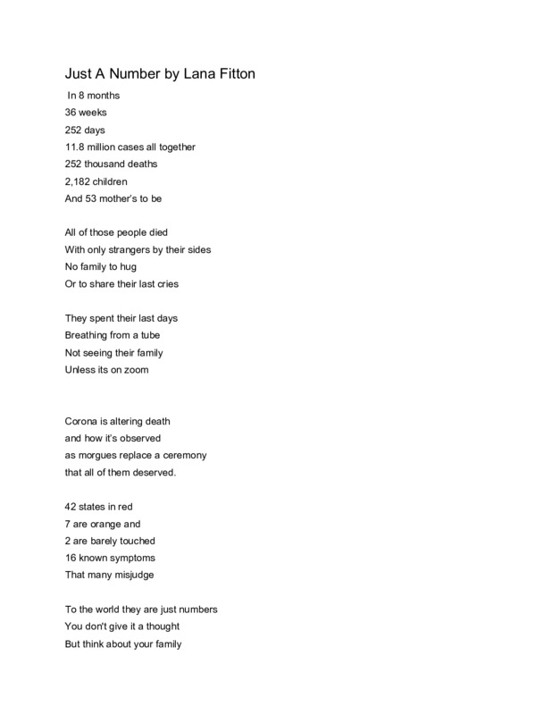 Coronavirus is a global pandemic that has disrupted all of our lives. I was just ending my senior year of high school, and i felt i had gotten everything taken away from me. As the numbers spiked, it became really scary and I realized how serious this really was. I want to show how serious this pandemic is in a poem i wrote.