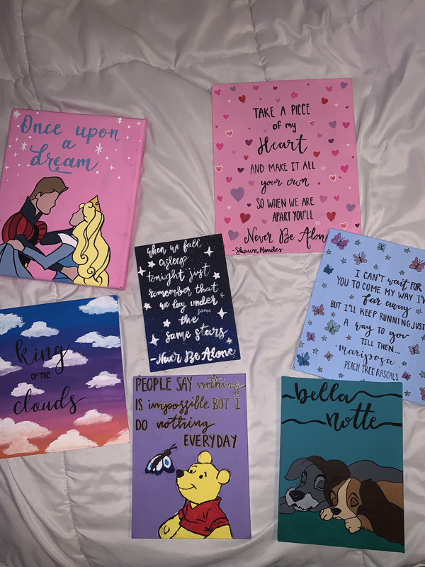 I decided to upload a picture of some of the paintings that I’ve made over the quarantine. When COVID-19 first started and we all went into quarantine I wondered what I was going to do during all my free time. I love to paint and I almost never had time to dedicate and do it. But now with all of this free time I had no excuse put to getting crafty and painting. As you can tell from this photograph there are a variety of paintings that I made. Some are pretty backgrounds with song lyrics/songs. My favorite one that I painted was the sunset sky with clouds. I also have a couple Disney paintings as well. It was also a huge help to get distracted and get my mind off of everything that was going on in the world. It was also very relaxing. These paintings are just some of the many things that I made during the quarantine. I also started to do embroidery as well as make Mickey ears and many many other crafts. It’s very important to me because it’s one of the ways that I was able to express myself during this weird tough time. I’m very thankful that I was able to find a creative outlet. I was also able to take some time for myself. Painting was my quiet relaxing time. From getting to choose colors, mixing, choosing what to paint. Just the whole process in itself made me feel a little bit better. I remember when quarantine first started that the stores were all running out of paint and canvases so I’m guessing I’m not the only one who came up with the idea of painting during this time. I’m glad people were also able to find outlets and time to relax and just paint.