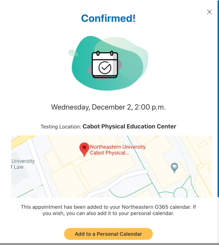 This is a screenshot of the confirmation email for the scheduling of my COVID-19 test at Northeastern University on December 2, 2020. When applying to colleges in late fall of 2019, I would have never thought that I would be getting COVID-19 tests every three days and that it would be part of my weekly schedule in college. Northeastern University's motto throughout this pandemic has been "protect the pack." If everyone does their part by getting tested every three days, wearing masks at all times, and practicing six feet social distancing, we will get through this and remain on campus for the entirety of the semester. At first it was a little odd and inconvenient having to get tested so often. However, after the first month it was completely normal. It is something that I can do to make sure that my campus is healthy and to protect the fellow student at my university.