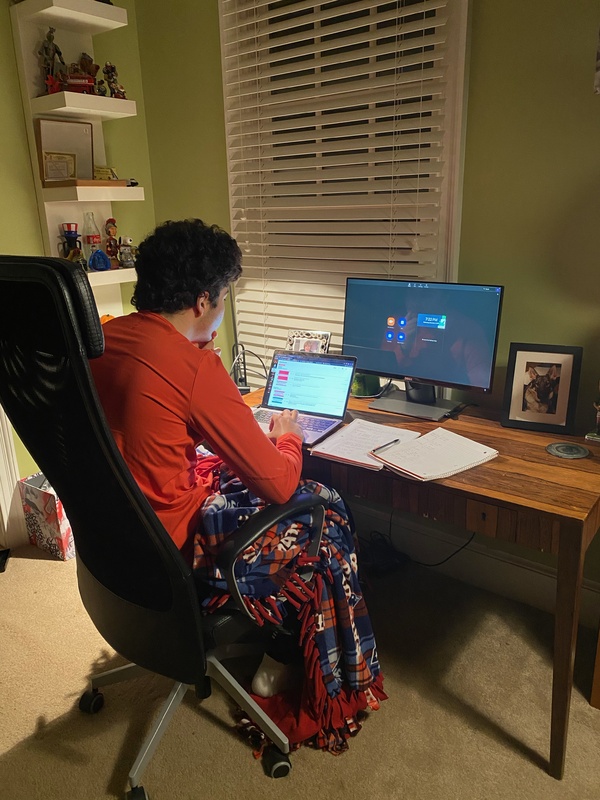 This is a picture of me, Dylan Sacks. I am currently a freshman at Northeastern University in Boston Massachusetts. Although I was on campus for the majority of the semester this year, I am home for about 10 weeks in total, because of the pandemic. Although Northeastern is unique compared to other schools because the majority of other schools around the country did not allow students to come back to campus after thanksgiving because of the pandemic, I made the personal choice to stay home until second semester begins (mid-january) for my own safety. This is where I spend most of my time, studying and working hard. On the computer monitor the application "Zoom" is pulled up. This is what all of my classes use so the students can feel as if we still have class. The difficulty is trying to feel as though these are normal times, and Northeastern and their amazing staff are doing everything they can to give us the closest they can to a traditional college experience.