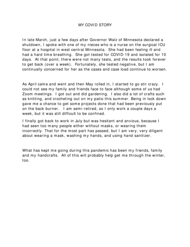This is a short COVID-19 reflection on the experience of Sonja Carlson, a semi-retired craft guru. The story is written as a Word Doc.