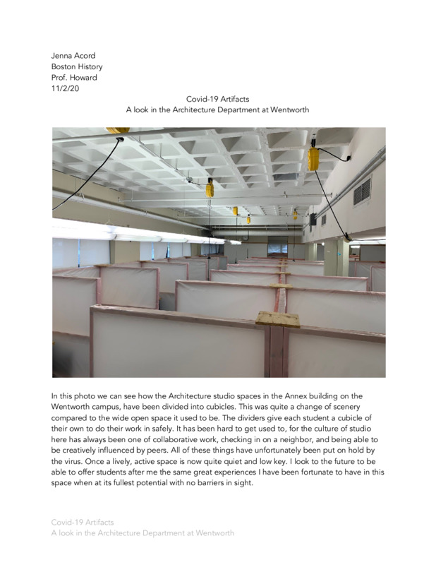 As soon as the Coronavirus hit, everyone was affected in either how they would work or how they were getting an education. I am currently an architecture student at Wentworth Institute of Technology in Boston, MA. I think everyone had hoped that the pandemic would be wrapped up in just a few months but unfortunately it was not. By summer 2020 I was about to begin my second semester of sophomore year with it being fully online. It was an extreme learning curve, classes were all on Zoom, and there was limited communication between me and my fellow classmates. We had to adapt from the handmade models we had done in previous years to digital models on new programs we had not used before. Through the entirety of the summer online semester, we had high hopes that somehow the fall semester would be different. But it was not. While the promise of hybrid classes was presented, everything was still so unknown that many of those promises fell through. We were told of the potential of a few in-person studio days and many students, like myself, decided to live on campus or even sign leases for apartments. But we were again met with the harsh reality of those in-person classes not happening. My school had come out with a plan of in-person studio days and we juniors were shocked to see that only our grade was given zero. We argued for at least a few in-person days throughout the semester, especially after having spent the entire summer semester fully online. We were finally given an opportunity to have an in-person class. While it is the reality that some of these events were out of the control of the school, it is still taking quite a toll on the students. We are losing that essential in-person connection that we usually get with classes such as studio. With the Covid-19 virus still ever present in November of 2020, we all have dim hopes of what the Spring semester of 2021 will bring.
