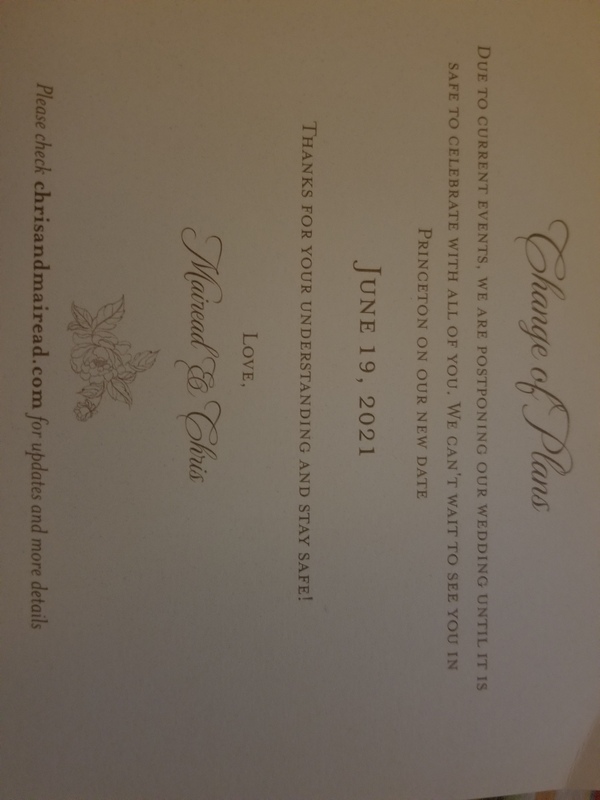 A notification that a wedding at which my entire family had been planning to gather will be delayed an entire year due to Coronavirus concerns.