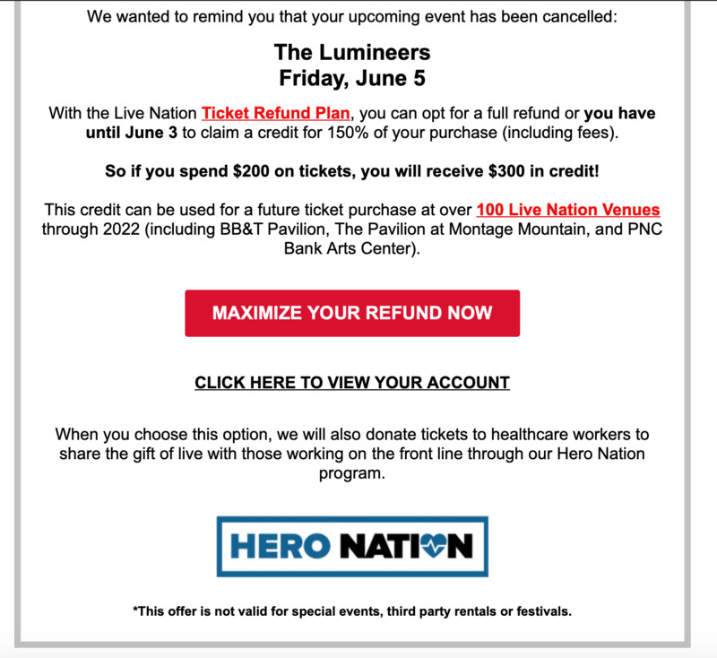 The image I have concluded is a screenshot of the email that I received from BB&T Pavilion detailing that the concert was cancelled, but I had the option to donate my tickets to healthcare workers on the frontline. While I am upset that I was not able to attend the concert in June, I believe that healthcare workers should be compensated for their time, sacrifice, and devotion to the betterment of our society through their tireless efforts in healthcare. This option is a perfect example of how individuals can give back to members of our society that are fighting to end the COVID-19 pandemic and to acknowledge their progress and effort to keep every person safe from sickness.