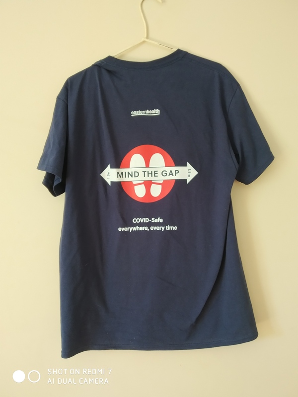 This photo depicts a "Mind the Gap" t-shirt. "Mind the Gap" is a campaign run by the Eastern Health service to promote social distancing among patients and staff within hospitals.