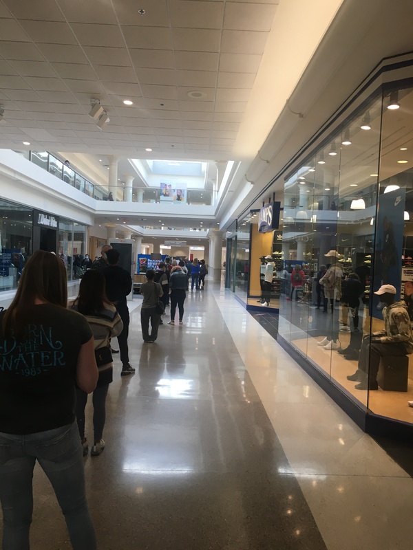 Sunday Morning at the mall. Due to limit number of customers at the stores, the lines to get in are very long.