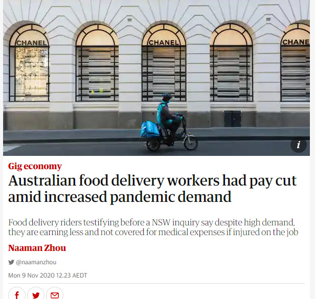 Insecure work is nothing new but I was too lucky to hop onto welfare when my hospitality job wrapped up for the lockdown. Really feel for my colleagues, international students and others who aren't supported in the same way and have to hustle in exploitative arrangements. No workers compensation, pay well below minimum wage, and increased risk of contracting coronavirus all while keeping the city fed. These folks are holding it down for us without getting much back. Reform is needed.