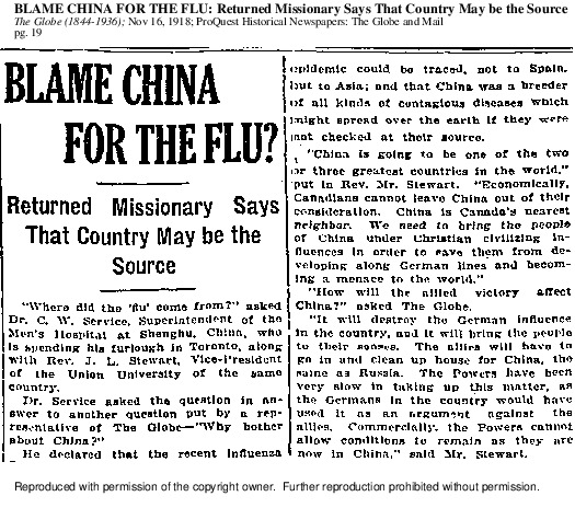 In the article, the author states that the pandemic could be traced not to Spain but Asia; and that China was a breeder of all kinds of contagious diseases which might spread over the earth if they were not checked at their source.