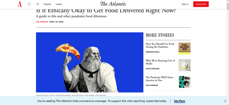 With the advent of the COVID-19 pandemic, people began to grapple with moral dilemmas about the new, deadly situation that they found themselves in. These ethical dilemmas, which are the focus of a brief Atlantic Monthly article by Joe Pinsker, concerned the basic, but important issue of procuring food and drinks, which now ran the risk of infecting and possibly killing innocent essential workers and delivery drivers. To help soothe the troubled consciences of the general public, Pinsker consulted a variety of medical professionals, food scientists, ethicists, and moral philosophers to come up with answers to the ethical questions raised by these new circumstances.