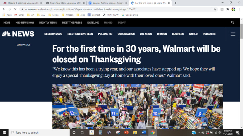 What I have submitted is important to me, because while I have worked retail and understand the important of everyone being able to share Thanksgiving with their families and friends and also the importance of everyone’s safety during the pandemic, I happen to be someone that did not celebrate Thanksgiving on Thanksgiving day. My family was always working and instead of being home alone on the holiday, I went shopping by myself, or if I was lucky, with a friend. I’m beyond ecstatic for retail workers that will finally get to spend the holiday with their families and friends as some have not had the holiday off in over 20 years. Perhaps this year, we as a family, will celebrate on Thanksgiving day for the first time in almost 15 years.