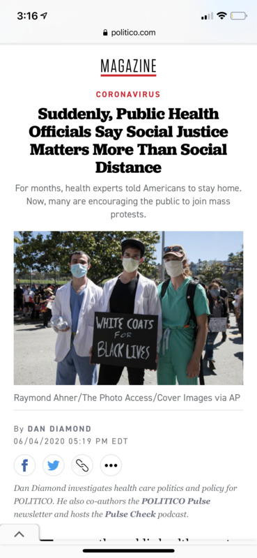 This article is about public health officials urging people to join the fight for social justice. While the health officials state that everyone involved needs to be aware of the risks and take precautions, now is the time to demand change and join in solidarity with those affected by racial injustice. This post demonstrates that during the COVID-19 pandemic, health officials were agreeing with protests and the Black Lives Matter movement. This article is important because it demonstrates that social justice is needed yesterday, today, and tomorrow no matter what is happening.