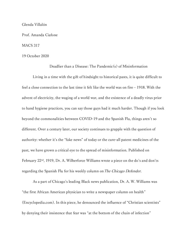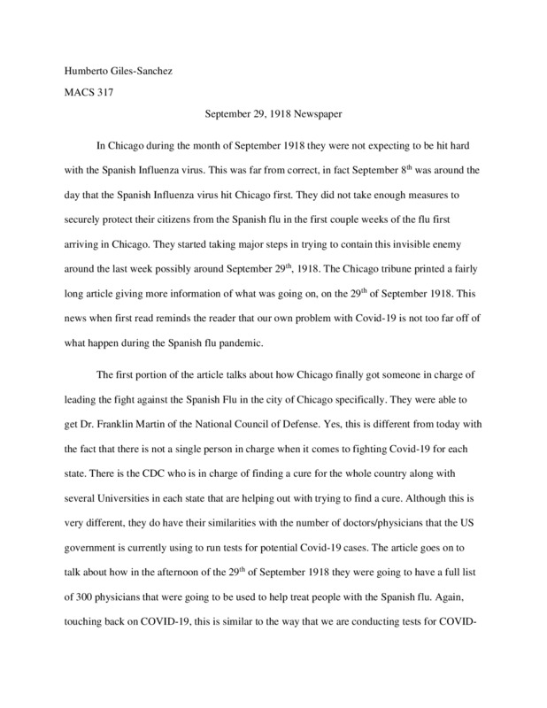The reason why I submitted this paper was to show the similarities between both the Spanish Flu and the current Covid-19 pandemic that we are going through. As philosopher George Santayana would say, "Those Who Do Not Learn History Are Doomed To Repeat It."
