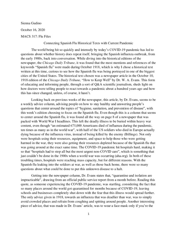 My essay shows just how similar the Spanish flu outbreak is with the COVID-19 pandemic and emphasizes the fact that we should've been so much more prepared today, with all of our modern technology and science, than we were in 1918. The newspaper article I look at also shows the shocking differences between the two, like the zero urgency for quarantining and the different kinds of masks and methods that were used to try and treat these illnesses.