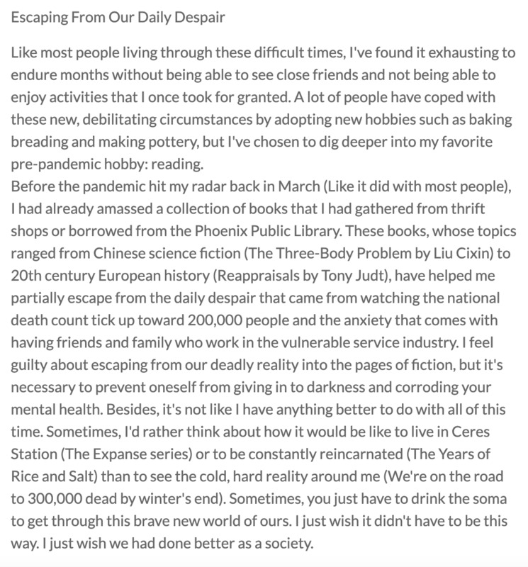 Before the pandemic hit my radar back in March (Like it did with most people), I had already amassed a collection of books that I had gathered from thrift shops or borrowed from the Phoenix Public Library. These books, whose topics ranged from Chinese science fiction (The Three-Body Problem by Liu Cixin) to 20th century European history (Reappraisals by Tony Judt), have helped me partially escape from the daily despair that came from watching the national death count tick up toward 200,000 people and the anxiety that comes with having friends and family who work in the vulnerable service industry. I feel guilty about escaping from our deadly reality into the pages of fiction, but it's necessary to prevent oneself from giving in to darkness and corroding your mental health. Besides, it's not like I have anything better to do with all of this time. Sometimes, I'd rather think about how it would be like to live in Ceres Station (The Expanse series) or to be constantly reincarnated (The Years of Rice and Salt) than to see the cold, hard reality around me (We're on the road to 300,000 dead by winter's end). Sometimes, you just have to drink the soma to get through this brave new world of ours. I just wish it didn't have to be this way. I just wish we had done better as a society.