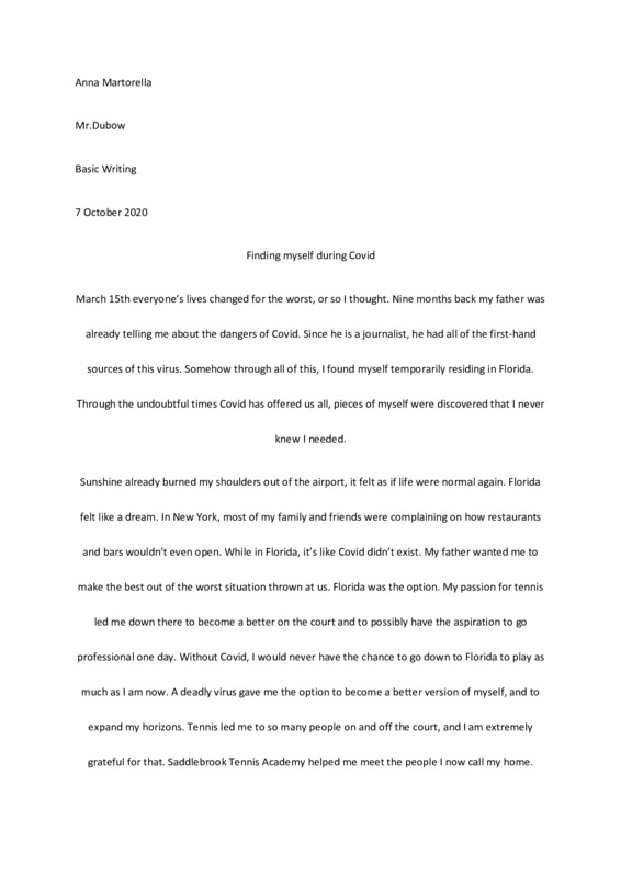 My story discusses how throughout Covid , I found a way to make it positive. A global pandemic turned millions of lives upside down. But, I won't allow this disease to kill off my dreams with tennis.