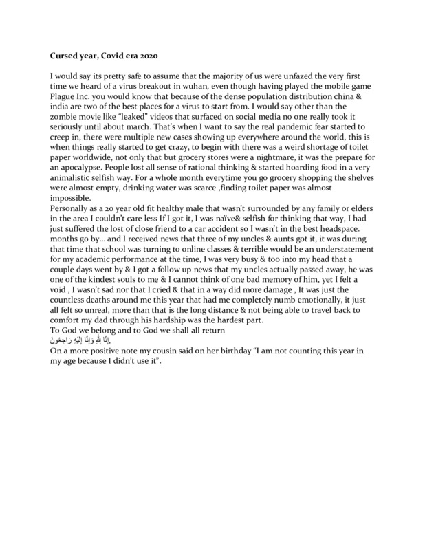 months go by… and I received news that three of my uncles & aunts got it, it was during that time that school was turning to online classes & terrible would be an understatement for my academic performance at the time, I was very busy & too into my head that a couple days went by & I got a follow up news that my uncles actually passed away, he was one of the kindest souls to me & I cannot think of one bad memory of him, yet I felt a void , I wasn’t sad nor that I cried & that in a way did more damage , It was just the countless deaths around me this year that had me completely numb emotionally, it just all felt so unreal, more than that is the long distance & not being able to travel back to comfort my dad through his hardship was the hardest part.