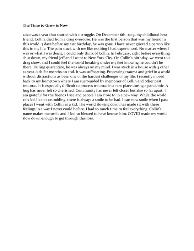 2020 was a year that started with a struggle. On December 6th, 2019, my childhood best friend, Collin, died from a drug overdose. He was the first person that was my friend in this world. 3 days before my 21st birthday, he was gone. I have never grieved a person like this in my life. The pain stuck with me like nothing I had experienced. No matter where I was or what I was doing, I could only think of Collin. In February, right before everything shut down, my friend Jeff and I went to New York City. On Collin's birthday, we went to a drag show, and I could feel the world breaking under my feet knowing he couldn't be there. During quarantine, he was always on my mind. I was stuck in a house with 4 other 21-year-olds for months on end. It was suffocating. Processing trauma and grief in a world without distractions as been one of the hardest challenges of my life. I recently moved back to my hometown where I am surrounded by memories of Collin and other past traumas. It is especially difficult to process traumas in a new place during a pandemic. A hug has never felt so cherished. Community has never felt closer but also so far apart. I am grateful for the friends I see and people I am close to in a new way. While the world can feel like its crumbling, there is always a smile to be had. I can now smile when I pass places I went with Collin as a kid. The world slowing down has made sit with these feelings in a way I never could before. I had so much time to feel everything. Collin's name makes me smile and I feel so blessed to have known him. COVID made my world slow down enough to get through this loss.
