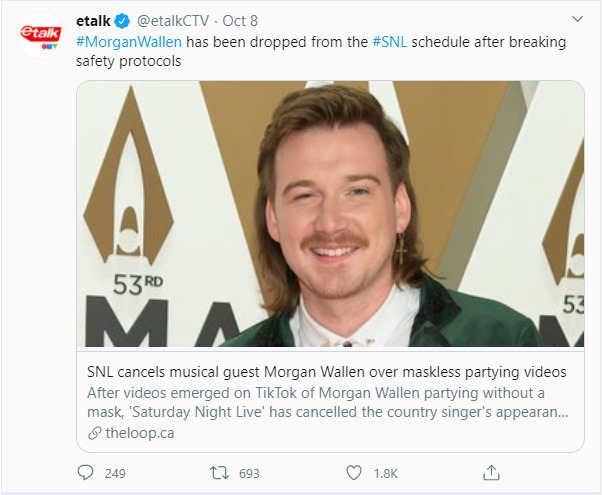 @etalkCTV on twitter shares an article on how musical guest Morgan Wallen's guest appearance on SNL is canceled due to videos seen of him partying maskless. I am glad that people are being held accountable for not following the correct social distancing and sanitary procedures.