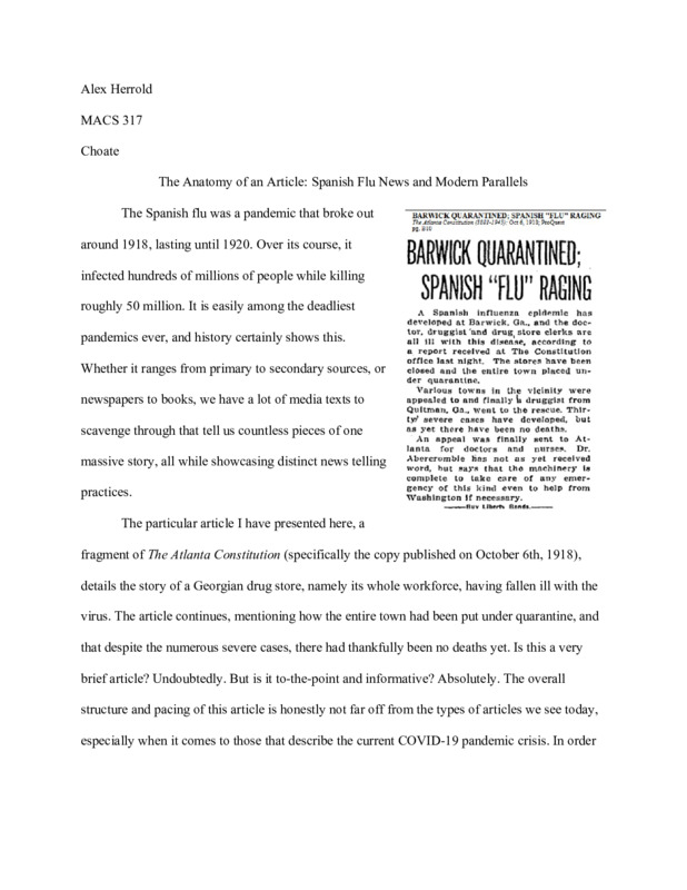 While it does not delve into my personal life and experiences, it does compare two points in time and how specifically the news has approached two flu pandemics. As expected, there are some major similarities. The essay specifically analyzes the structure for a short 1918 news article written about the Spanish flu.