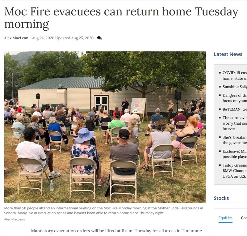 Amidst the coronavirus pandemic many people in California have been evacuated to fairgrounds throughout the state. This article includes a photo showing the social distancing measures that still need to be observed by during this additional crisis. Evacuees sit on folding chairs distanced from each other and many people wear masks as they attend an information briefing at the Mother Lode Fairgrounds in Sonora.