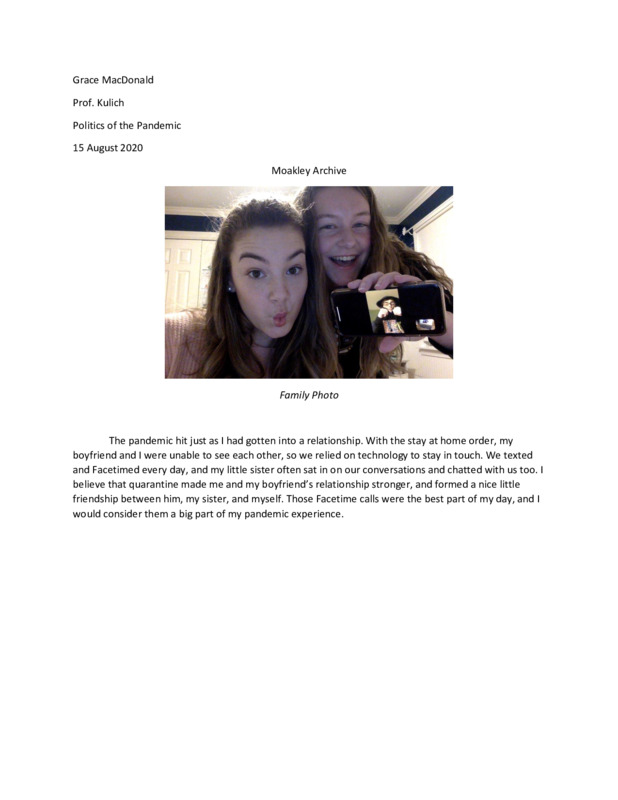 My favorite thing about working with the archive was curating. I just loved seeing all of the items come through and reading the stories attached to them. Beyond that, I feel like I have a great base of people I can now lean on through the rest of my time at ASU. I now have teacher friends in California with whom I am now sharing distance learning ideas. I hope these are the things that stand out when people think back to the Covid-19 pandemic. While it seems to be tearing through our country and pulling us apart, there's been a lot of good to come. I'm eternally grateful to have been presented with this opportunity, and I cannot wait to see how large this archive grows.