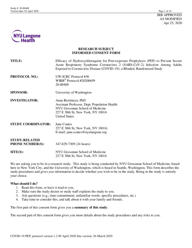 “Your other options: There are currently no approved treatments to prevent infection or COVIF-19 symptoms for people who have had contact with an infected person. You do not have to participate in this study.