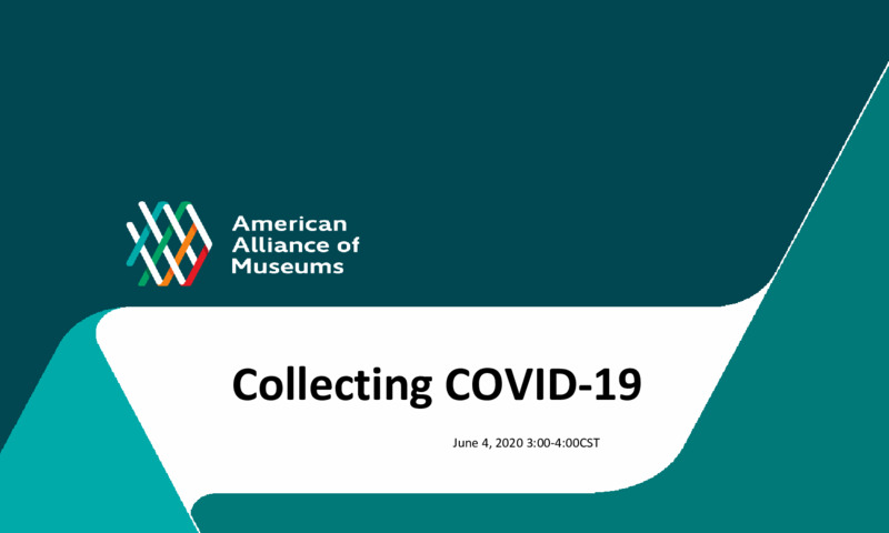 On June 4, 2020 the Curators Committee of the American Alliance of Museums presented a session focused on Collecting COVID. The session called attention to the importance of documenting significant history while living in a pandemic and discussed the Who, What, Where, When, Why and How of collecting objects, ephemera and materiel in the time of crisis. The presenters (Stacey Swigart, Drexel Lenfest Center for Cultural Partnerships; Thomas Lonnberg and Tory Schendel Cox, Evansville Museum of Arts; Juilee Decker, Rochester Institute of Technology; and Redmond Barnett, Historian/Consultant) reviewed best practices, safety measures, look at museums who are collecting and how communities can/are involved and what communities can do to document your local/regional history. This item is a PDF of their entire presentation.