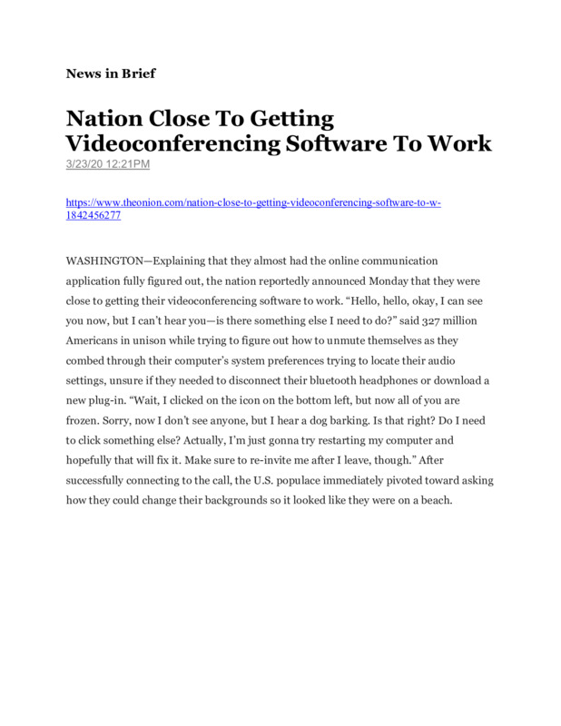 The Onion has been having a field day with the unbelievable times we are living through. They are doing a great job making fun of what is happening and our reaction to it. This article, written as we had to make an overnight change to working remotely and homeschooling, makes us laugh at how we struggled to get the videoconferencing software to work. People across America were all saying in union, "Can you hear me?" "Can you see me?" and "I don't know how to fix it."