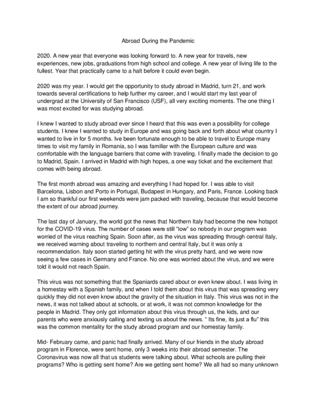 I have decided to share my study abroad experience and how people were really not expecting a pandemic and what was done as a result of the spread.