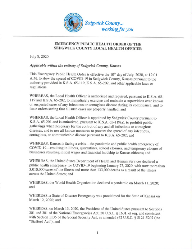 After the city of Wichita decreed compulsory mask-wearing, the Sedgwick County Local Health officer issued an emergency order overriding the County Commission's decision to not make masks in public mandatory. The first order states that no penalties will enforce the mandate's provisions, while the second, issued the very next day, adds religious institutions to the list of exempted parties; a hot button issue that saw Governor Laura Kelly's administration besieged by lawsuits and accusations of abuse of power during the statewide lockdown. Therefore, these texts are products of the political tensions that hobbled Kansas's response efforts in the face of a surging COVID-19 crisis, with state and local leaders, most if not all of whom identified as Republicans, opting for non-existent counter-measures that prevented "executive overreach," but allowed the virus to flourish.