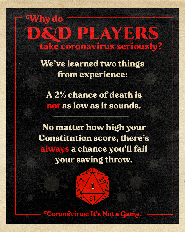 "Why do / D&D PLAYERS take coronavirus seriously? / We've learned two things from experience: / A 2% chance of death is NOT a low as it sounds / No matter how high your Constitution score there's ALWAYS a chance yo'll fail your saving throw. / Coronavirus: It's Not a Game."