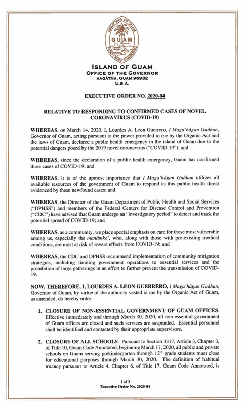 Ranging in date from March 16 to April 10, 2020, these executive orders proclaimed by the Governor of Guam detail that island's reaction to COVID-19's appearance there. These documents cover topics such as road accessibility for essential businesses and public health emergency operations, social distancing/isolation and clarifications of what is an essential and non-essential business, as well as telehealth expansion, and eviction/price gouging prohibitions during the public health emergency.