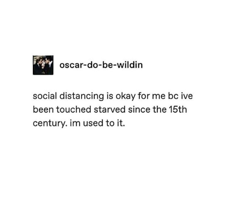 Social distancing is the main practice of COVID-19 that people have followed (six feet apart) BUT as a person who never liked being within six feet of strangers anyway it’s nothing new and also the fact that I am a touch-starved college student nothing has changed because of it
