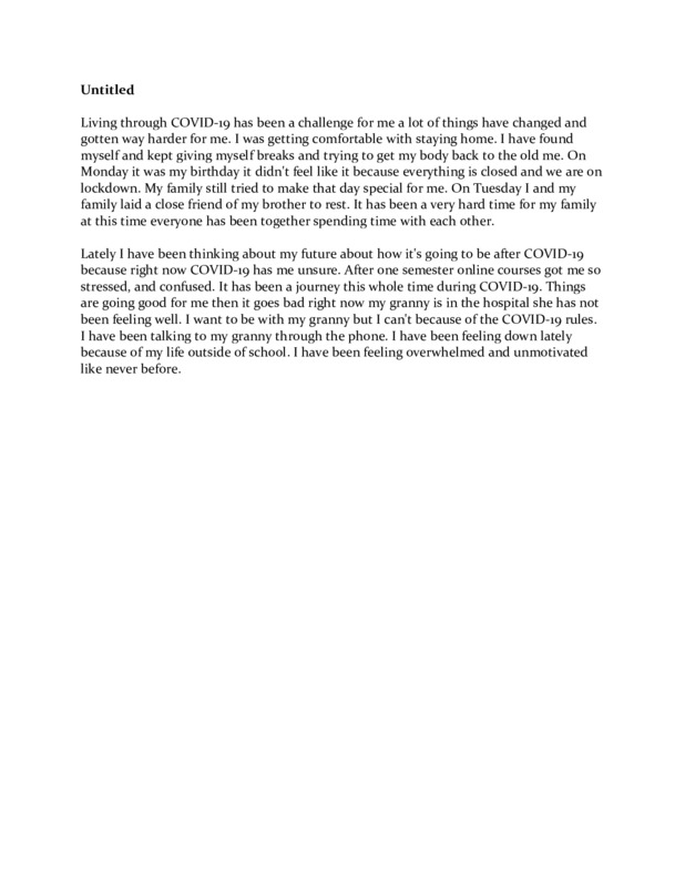 Lately I have been thinking about my future about how it's going to be after COVID-19 because right now COVID-19 has me unsure. After one semester online courses got me so stressed, and confused. It has been a journey this whole time during COVID-19. Things are going good for me then it goes bad right now my granny is in the hospital she has not been feeling well. I want to be with my granny but I can't because of the COVID-19 rules. I have been talking to my granny through the phone. I have been feeling down lately because of my life outside of school. I have been feeling overwhelmed and unmotivated like never before.