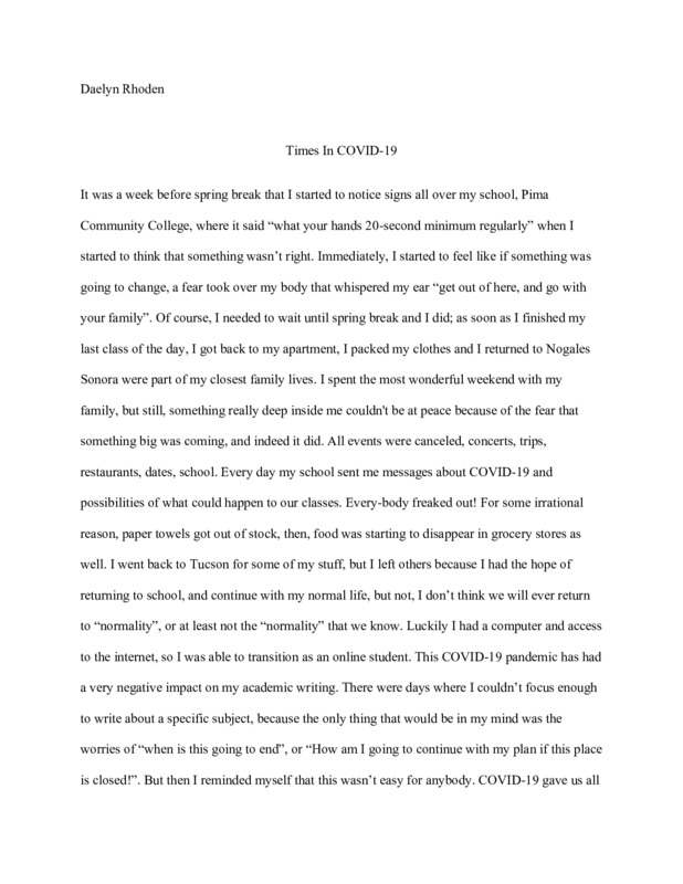 It was on March, 9 2020 that everything changed my whole college experience. Being a first year in college it was definitely a learning experience while everything was going good until that day when I left Pima Community College for the last time that semester. When i left that day I had no idea not even a thought that, that would be my last day on campus for the semester. It was our spring break that next week so we were out of school regardless until I received an email saying that they were going to extend spring break a few more days due to the whole pandemic. While the cases were rising and rising it was not looking good around the world in general with people dying everyday there was no way that we would return to in person classes for the rest of the semester. I received an email from all of my professors saying that we would transition to online learning and having online lectures. And to this day we had online lectures however it is the end of the semester and all classes are finished and we can only hope that we will get in person classes in the fall semester of 2020.