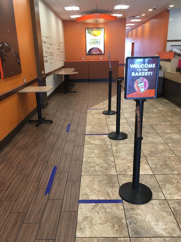 Color image of taped social distancing markers in coffee shop line. Dunkin' Donuts, Charlestown, MA.