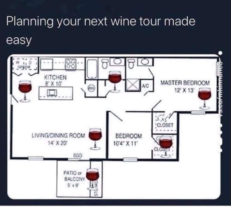 Meme showing route of a wine tour inside the house during quarantine