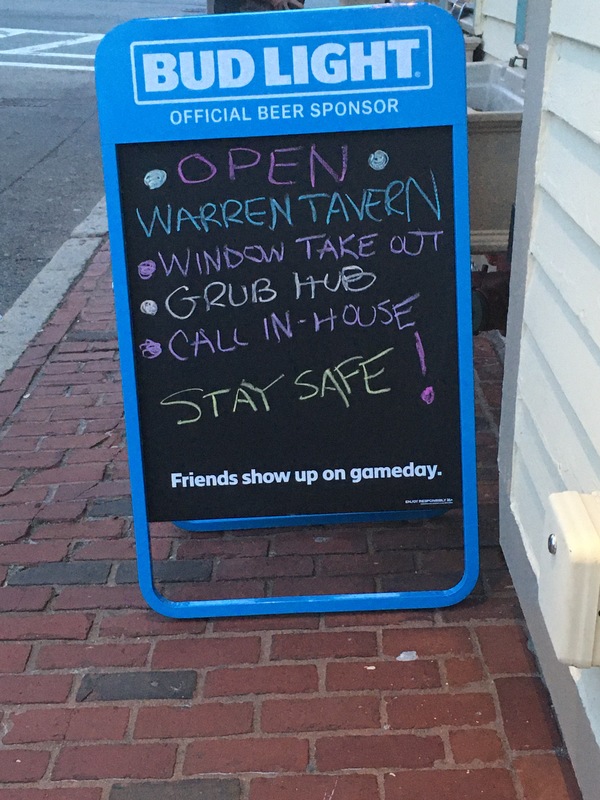 Color Image of restaurant blackboard urging people to stay safe during COVID-19 pandemic. Warren Tavern, Charlestown, MA.