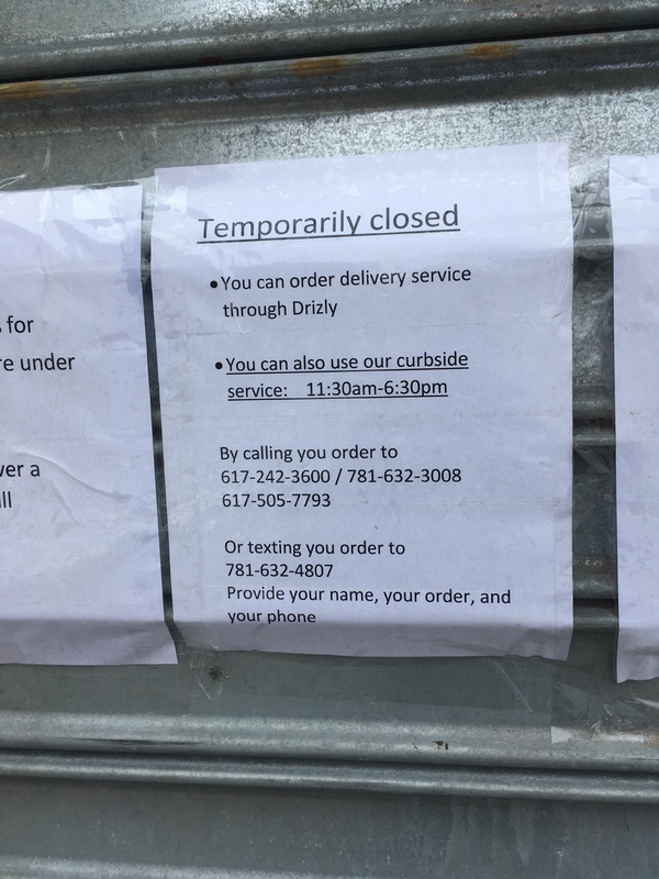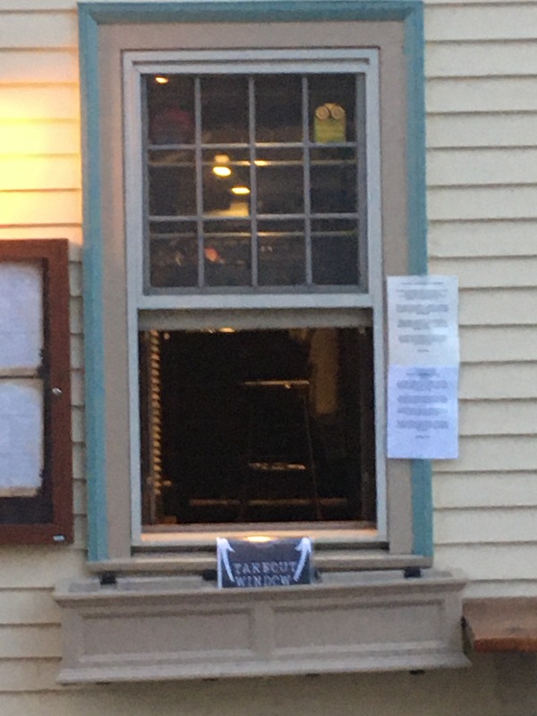 Photograph of flower box repurposed for contactless take-out during pandemic. Warren Tavern, Charlestown, MA.