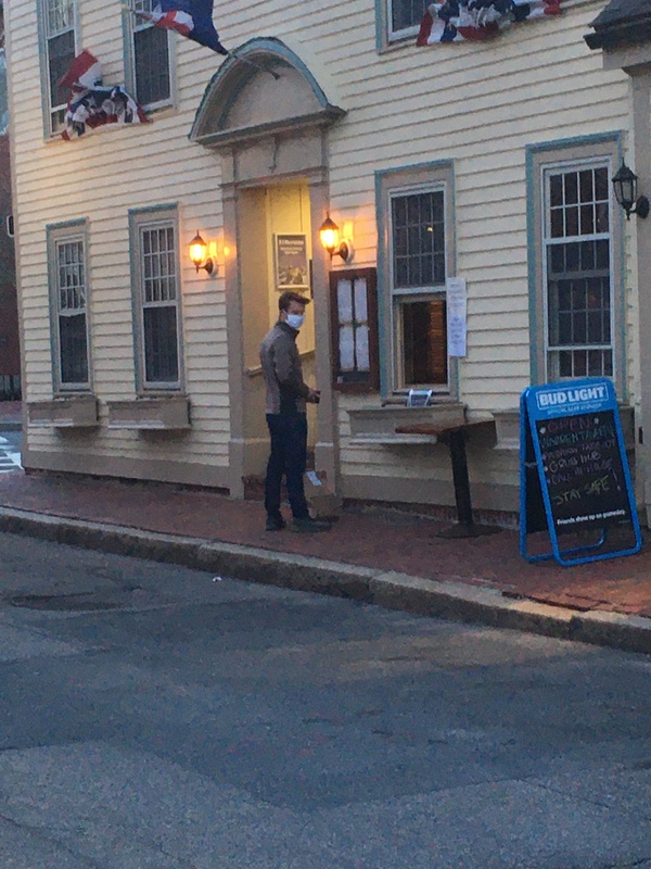 Color image of masked man doing contactless takeout pickup during COVID-29 pandemic. Warren Tavern, Charlestown, MA