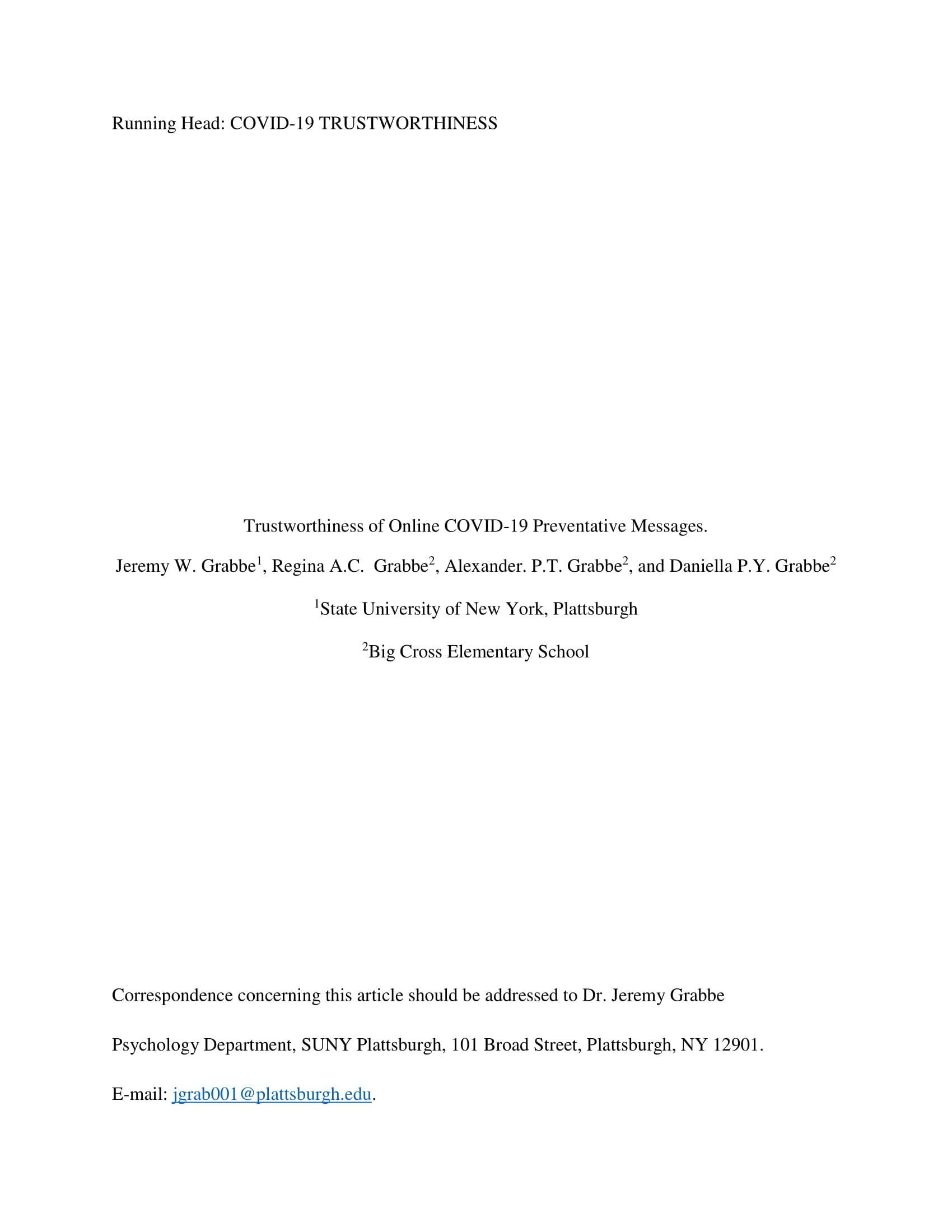 A small, informal study performed by Dr. Jeremy Grabbe, a Cognitive Psychologist at State University of New York, Plattsburgh at Queensbury, and his 7-year-old triplets on what resources people trust during the pandemic. The survey gave the same information on Covid-19 to all participants, but varied the source they attributed this information to and recorded the subject’s trust in that information. Grabbe undertook the study to help his three kids learn the scientific method while at home due to school closures. The study attracted attention from local news and was a featured story on National Public Radio’s Weekend Edition, May 3, 2020.