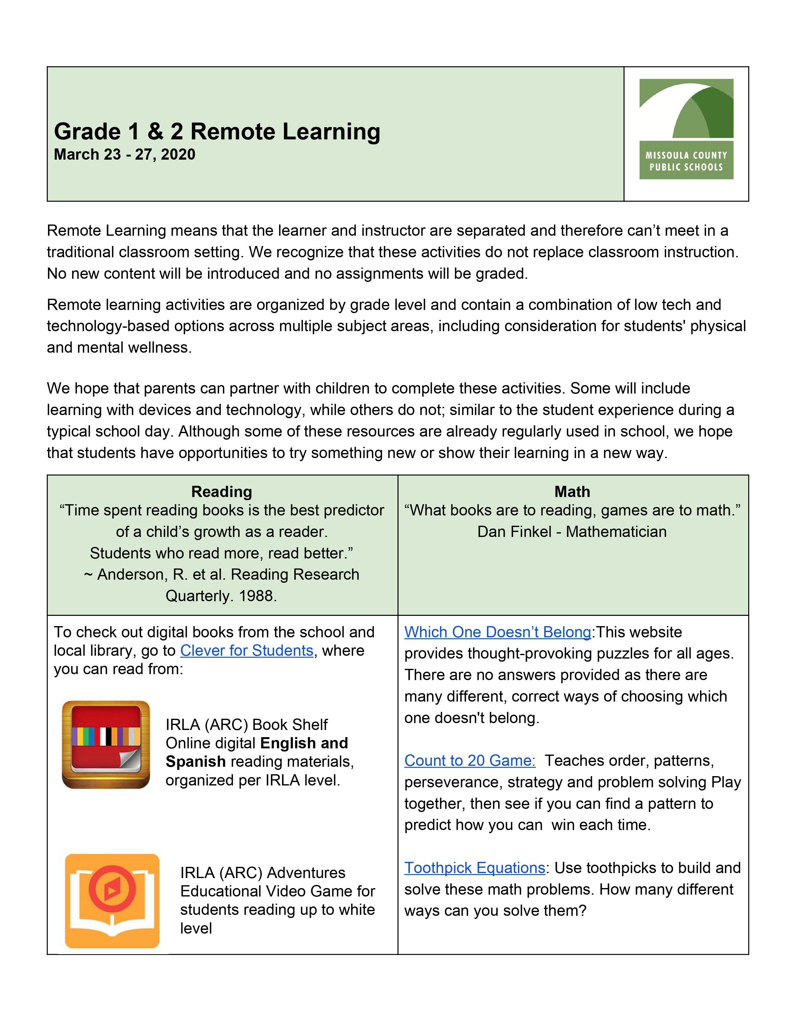 A weekly lesson plan for remote learning issued by the Missoula, MT County Public Schools for the week March 23-27, 2020. It suggests daily activities in core subjects including reading, math, science, social studies, art, and P.E. for grades 1 and 2, including both online and paper activities that students and parents can do at home.