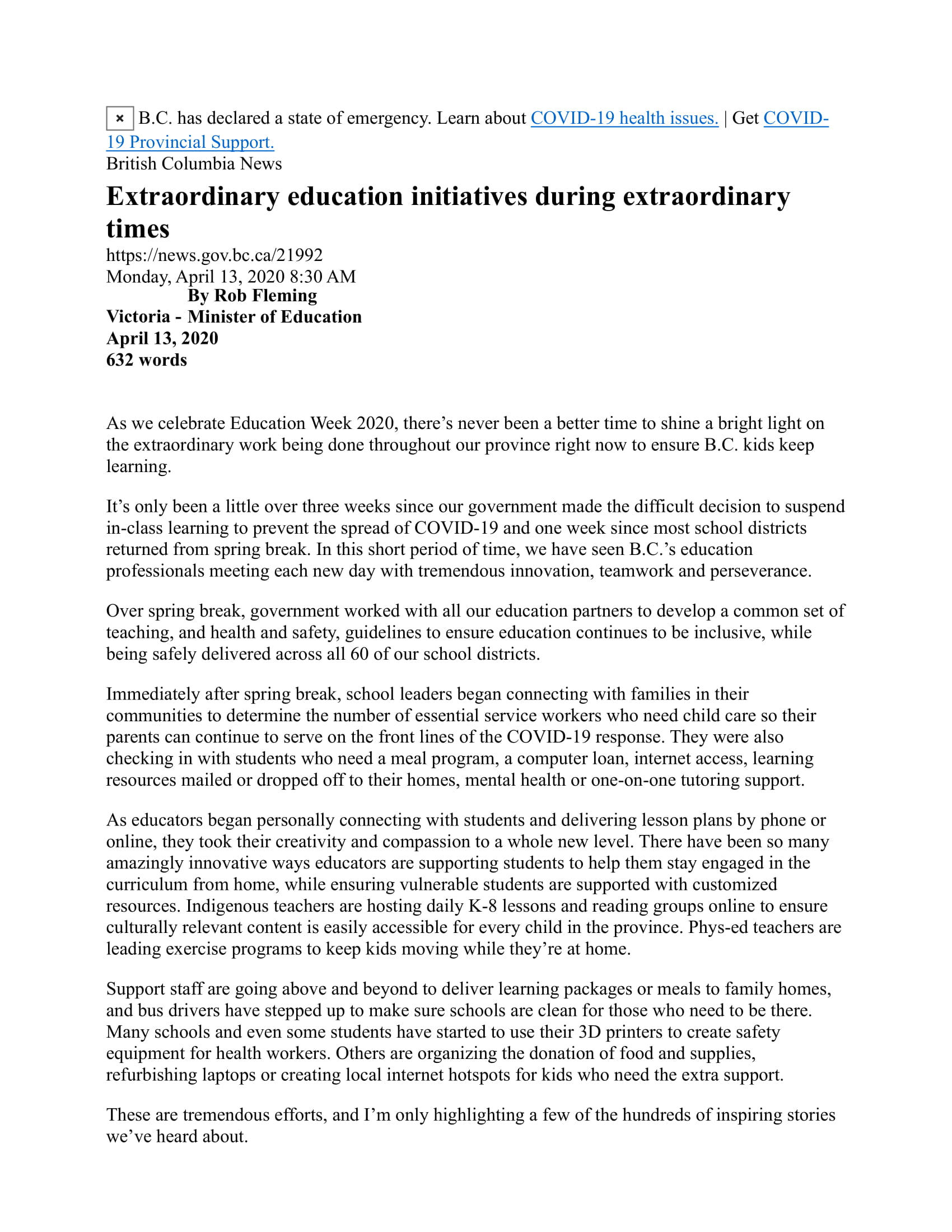An opinion piece by the British Columbia Minister of Education celebrating Education Week and shining a light on the work that schools staff have put into the transition to distance learning. He highlights various programs teachers are putting together to ensure that all students have access to important, culturally relevant education throughout the school closures and praises creative ways schools have been connecting with their students.