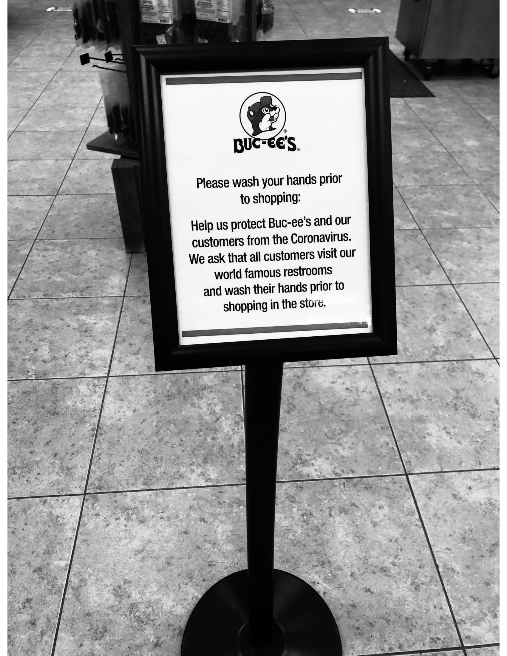 In this image at a Gas Station named Bucees, they have put up warnings and instructions to wash and sanitize their hands before entering the gas station to prevent Covid-19 spread to employees.