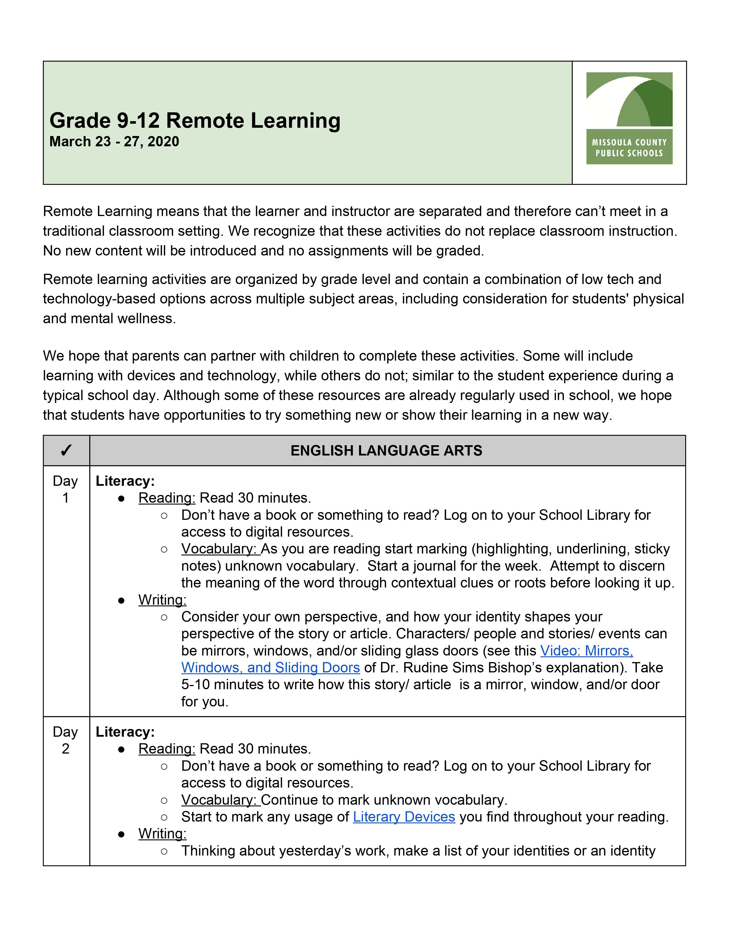 A weekly lesson plan for remote learning issued by the Missoula, MT County Public Schools for the week March 23-27, 2020. It suggests daily activities in core subjects including reading, writing, math, science, social studies, and P.E. for grades 9-12, utilizing primarily online activities for students to complete at home.