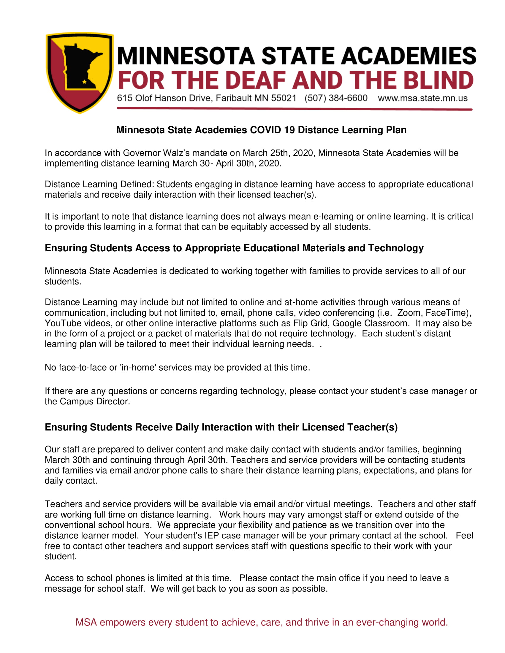 A plan put out by the Minnesota State Academies for the Deaf and the Blind that details how distance learning will be implemented for students in the first month of school closures. It highlights ways in which the schools will work to continue to fulfill Individual Education Plans (IEPs) through distance learning and ways in which teachers and school staff will communicate with students to fulfill their needs during the closures.