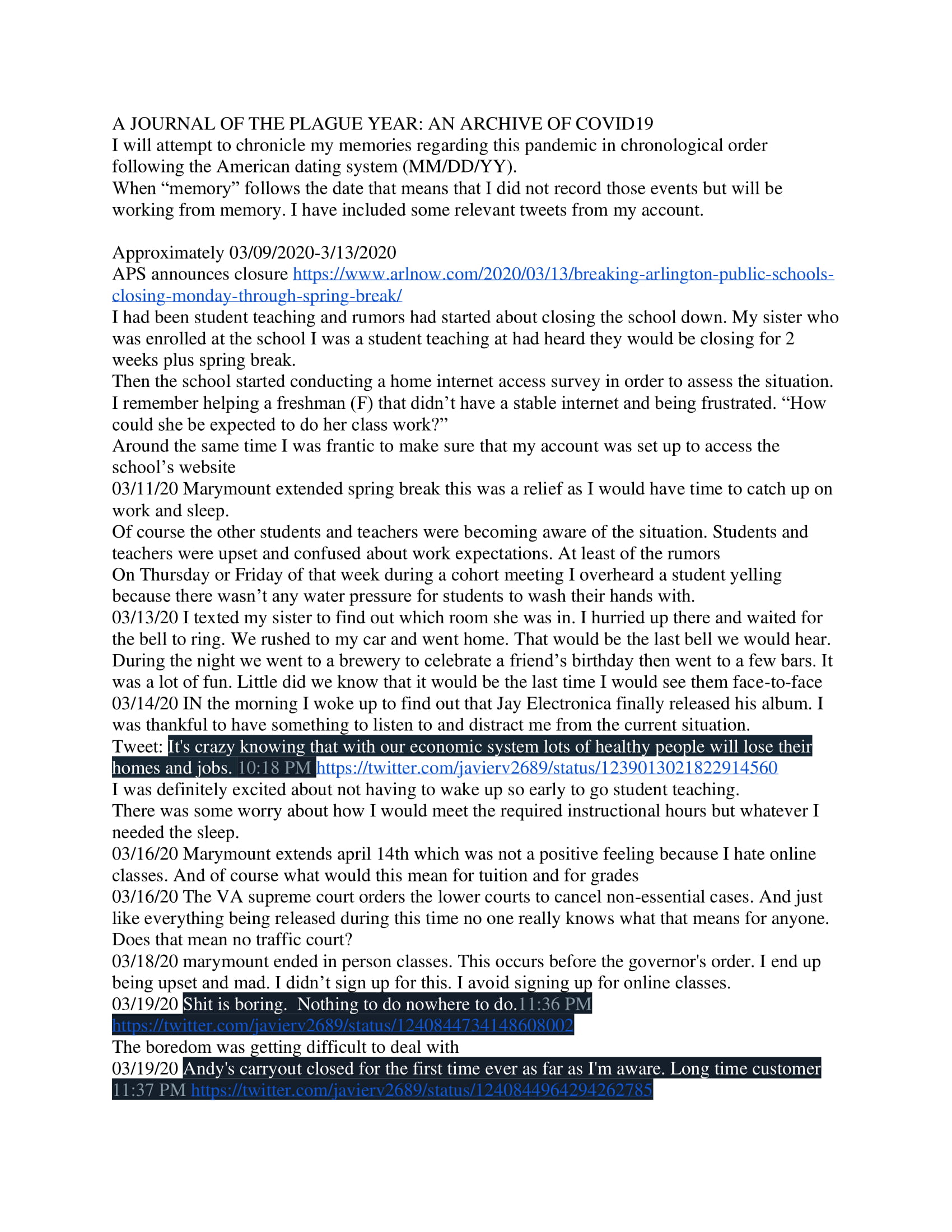 This recording is the life changes I have had to go through due to COVID 19. Not only has my life changed but American society as well. This health crisis has brought lots of fear to lose in high risk of being affected. So staying at home has become the new normal for me and most Americans. #CSUS #HIST15H