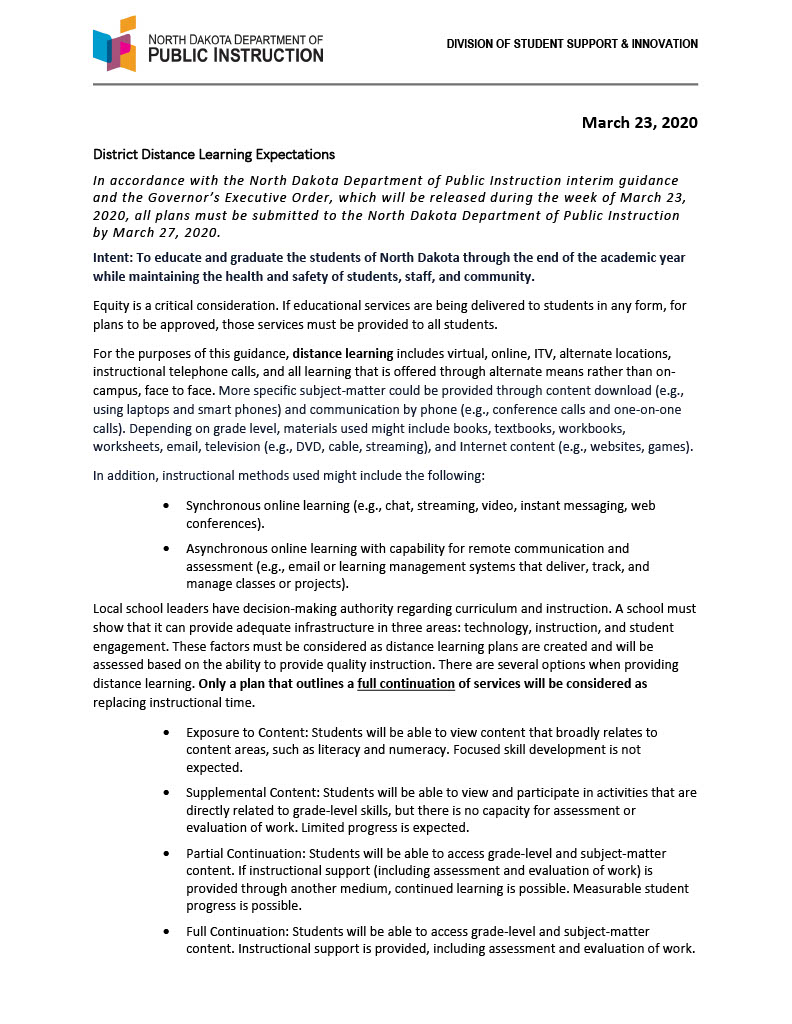 A memorandum to North Dakota school districts outlining expectations for district remote learning plans. It lists the goals and policies of the state for student graduation, grading, and attendance, and offers suggestions for strategies or tools districts can employ when writing and implementing their remote learning plans.