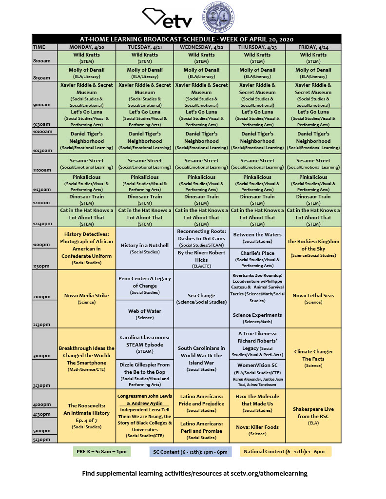 A broadcast schedule from South Carolina Educational Television (ETV), the state’s Public Broadcasting Service for the week of April 20-24, 2020 that outlines programming for different age groups and both state and national programming. Across the country PBS stations are partnering with state departments of education and individual school districts to provide on-air learning for students without internet access.